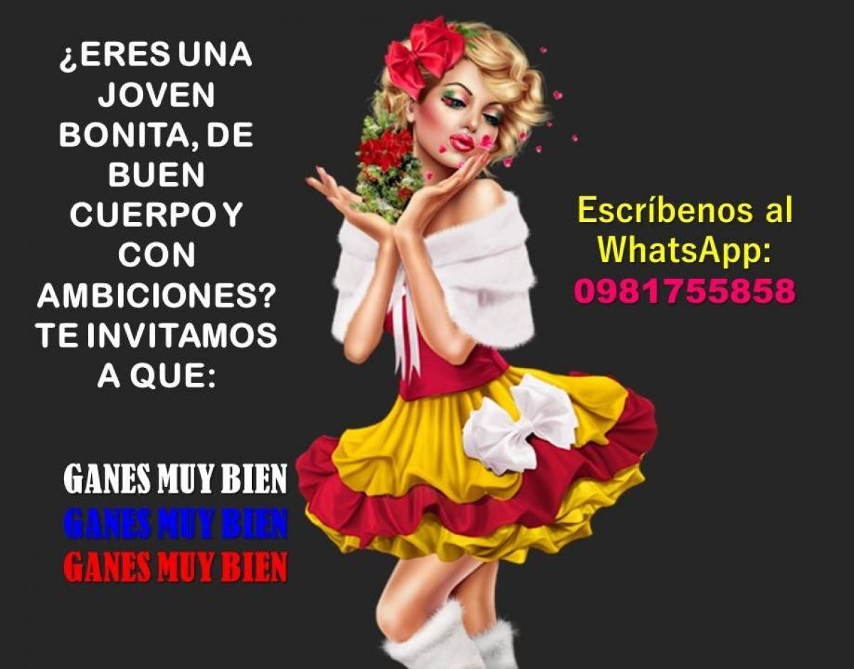 ¿Eres joven, bonita y con ambiciones claras? Nuestra agencia de hospitalidad ejecutiva selecciona chicas de 18 a 24 años para relacionarse con caballeros solventes y de alto estatus, en un entorno donde la seguridad, la discreción, el lujo y las grandes ganancias son prioridad absoluta. Altos ingresos diarios Elegancia y lujos a tu alcance Horarios flexibles y cómodos Vida privada totalmente reservada Interesadas enviar mensaje confidencial vía WhatsApp 0981755858. Si eres femenina, puntual y ambiciosa, esta es la oportunidad de transformar tu encanto en independencia económica y un estilo de vida premium reservado solo para chicas que saben lo que quieren.